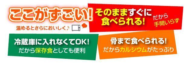 こんがり焼き上げ、独自の製法で頭から骨、しっぽまで丸ごと食べられる 焼き魚に仕上げました。封を開けてすぐに食べられます。